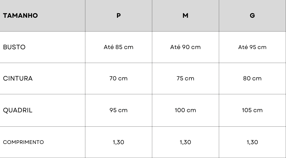• MODELAGEM MENOR (COMPARE SUAS MEDIDAS COM A TABELA PARA ESCOLHER O TAMANHO IDEAL)